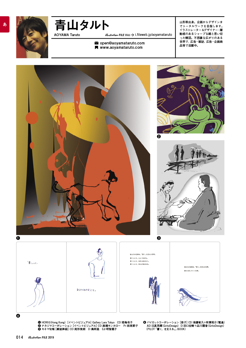 2019 1 香港のループショウに展示をご一緒いただきました。 group show at Pacific Place“ HON10 “ in Hong Kong 2 ”カエルのピクルス展”にご一緒させていただきました。 3 2017年.2018年はキネマ旬報さんで連載をご一緒いただきました。 "晩秋、小津安二郎" 尾形俊郎さん 4 (株)PILOTさんの 100執念記念小冊子にイラスト掲載いただきました。